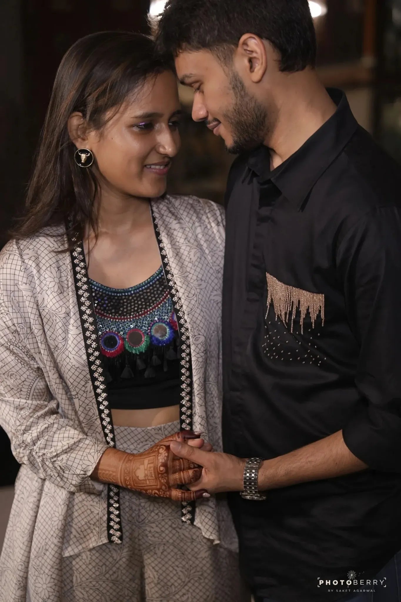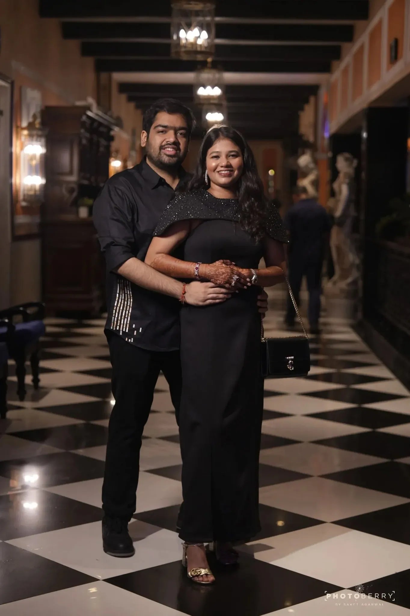 5. In sync, in style — Powder Duo dressed in black. Ayush and Sakshi Banka commanding attention in our Twilight Aura Maxi Dress and our Modern Outlook Shirt.